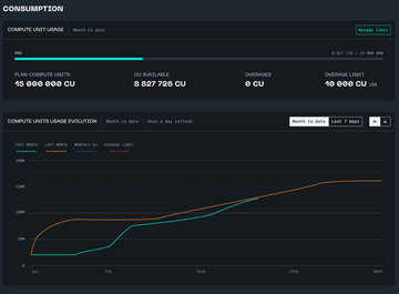 This graph is updated daily and allows you to follow your consumption easily. You can compare it with the usage of the previous month. You can confront it to your monthly available Compute units and overage allowance.
