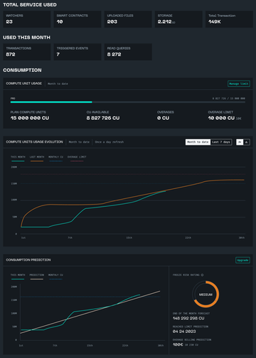 The Dashboard serves as the homepage of your project, offering comprehensive data on your service usage. Here, you can easily view the number of IPFS storage units you've used, the number of transactions you've carried out, how many read queries you've made, and the number of Watcher events you've tracked. This information can help you gain a better understanding of which services are most important to your project and how much of each service you use.